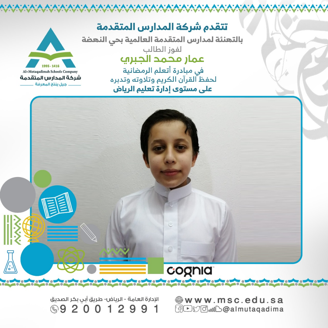 . الطالب عمار محمد الجبري الفوز بالمركز الاول علي مستوي ادارة تعليم الرياض