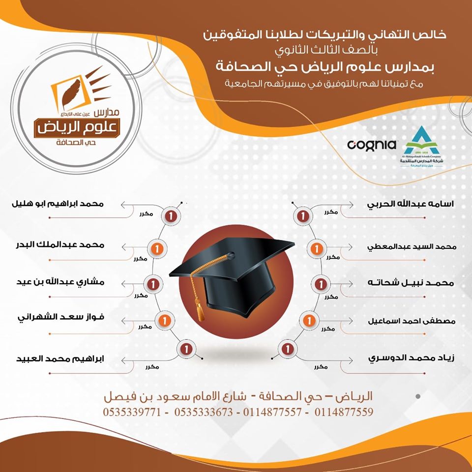 خالص التهاني والتبريكات لطلابنا المتفوقين بالصف الثالث الثانوي بمدارس علوم الرياض الصحافة