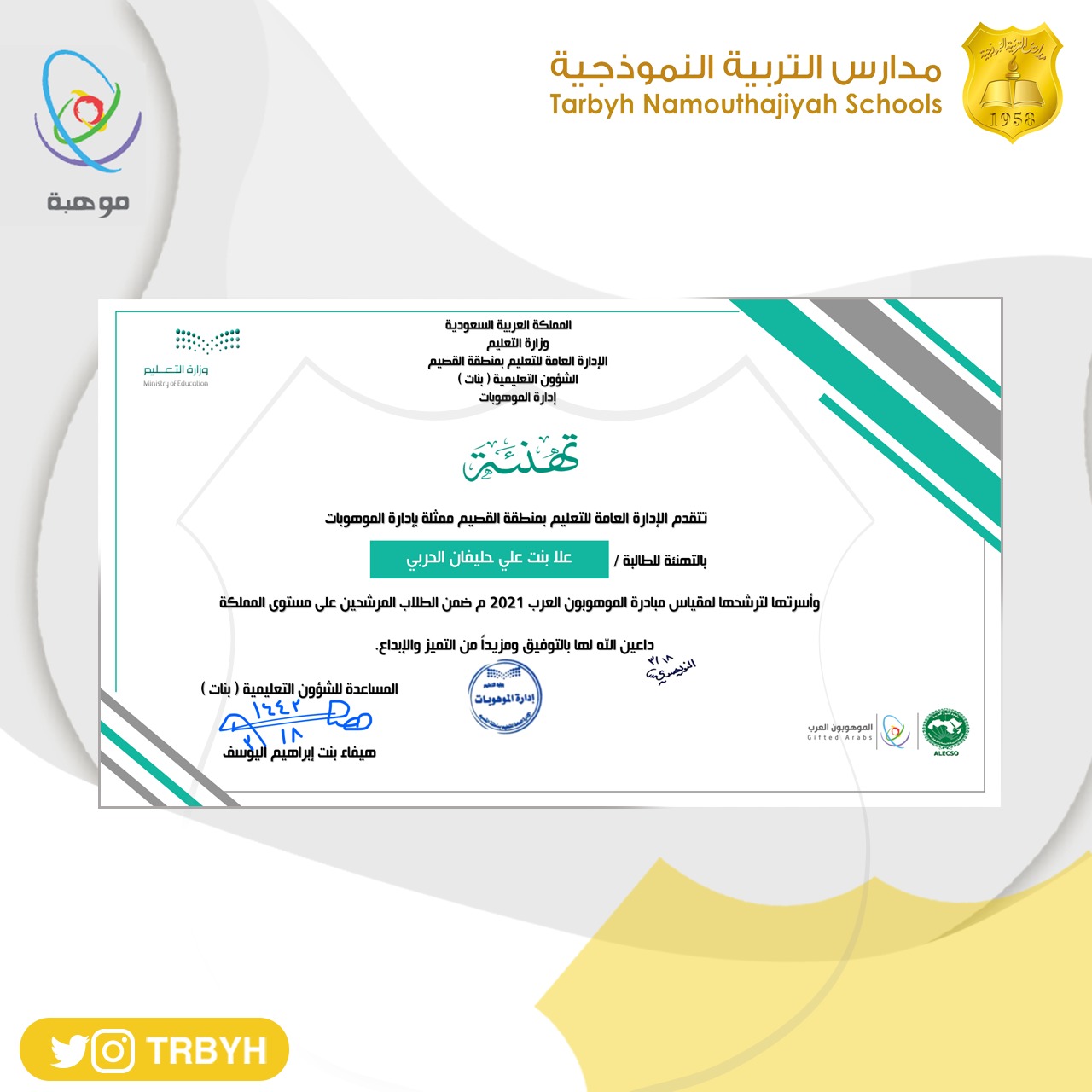 تفخر #مدارس_التربية_النموذجية بالطالبة/ علا بنت علي الحربي لترشحها لمقياس مبادرة الموهوبين العرب ٢٠٢١م ضمن الطلاب المرشحين على مستوى المملكة