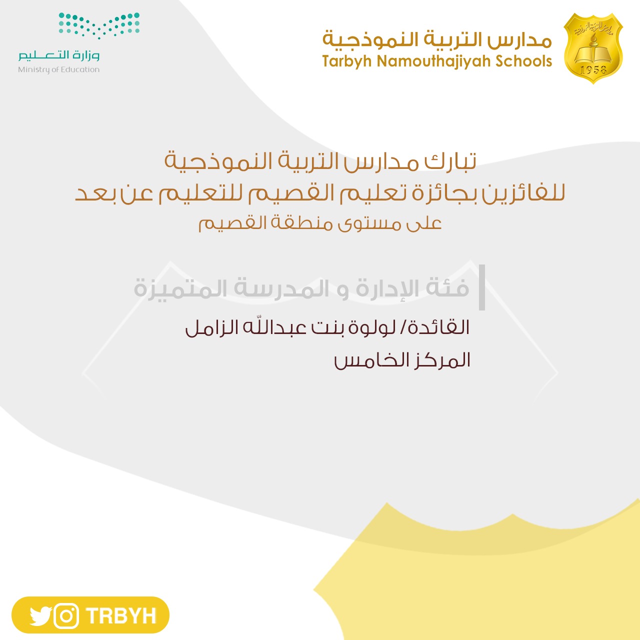 تهنىء #مدارس_التربية_النموذجية القائدة لولوة عبدالله الزامل من فئة الإدارة والمدرسة المتميزة بحصولها على جائزة (تعليم القصيم للتعلم عن بعد) المركز الخامس، مع اطيب التمنيات لها بدوام التوفيق